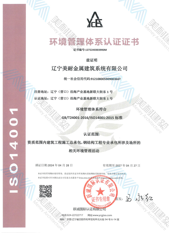 遼寧美耐金屬建筑系統有限公司位于遼寧(營口)沿海產業基地,專注于預制金屬建筑系統領域,是一家集工業建筑設計、制作、施工及相關的技術咨詢與服務為一體的綜合性服務企業。作為國家鋼結構協會會員、中國建筑金屬結構協會會員單位與國家高新技術企業,美耐建筑集建筑工程施工總承包、鋼結構工程專業承包等多種資質于一身,并擁有22項鋼結構建筑領域專利,9項軟件著作權。